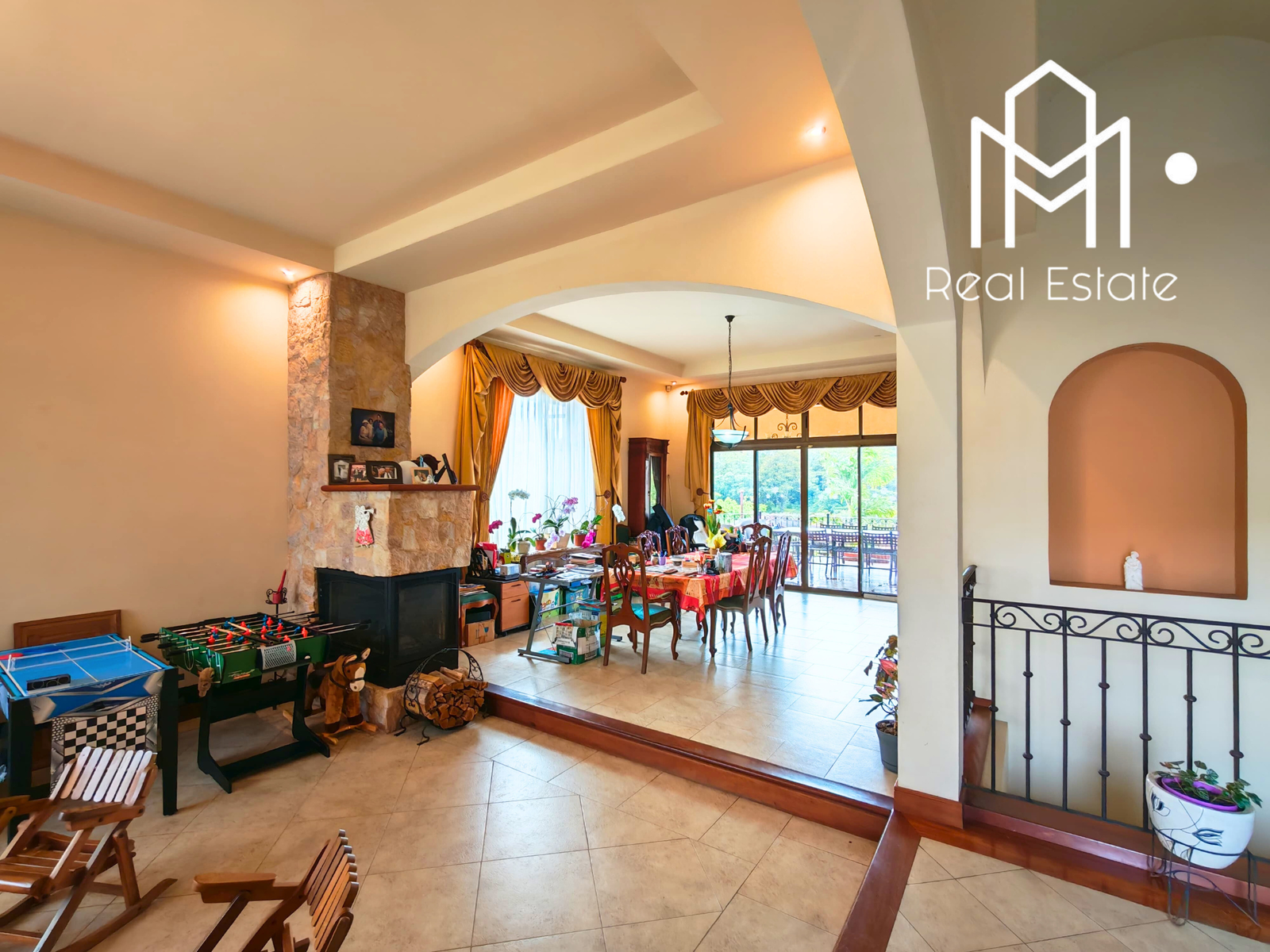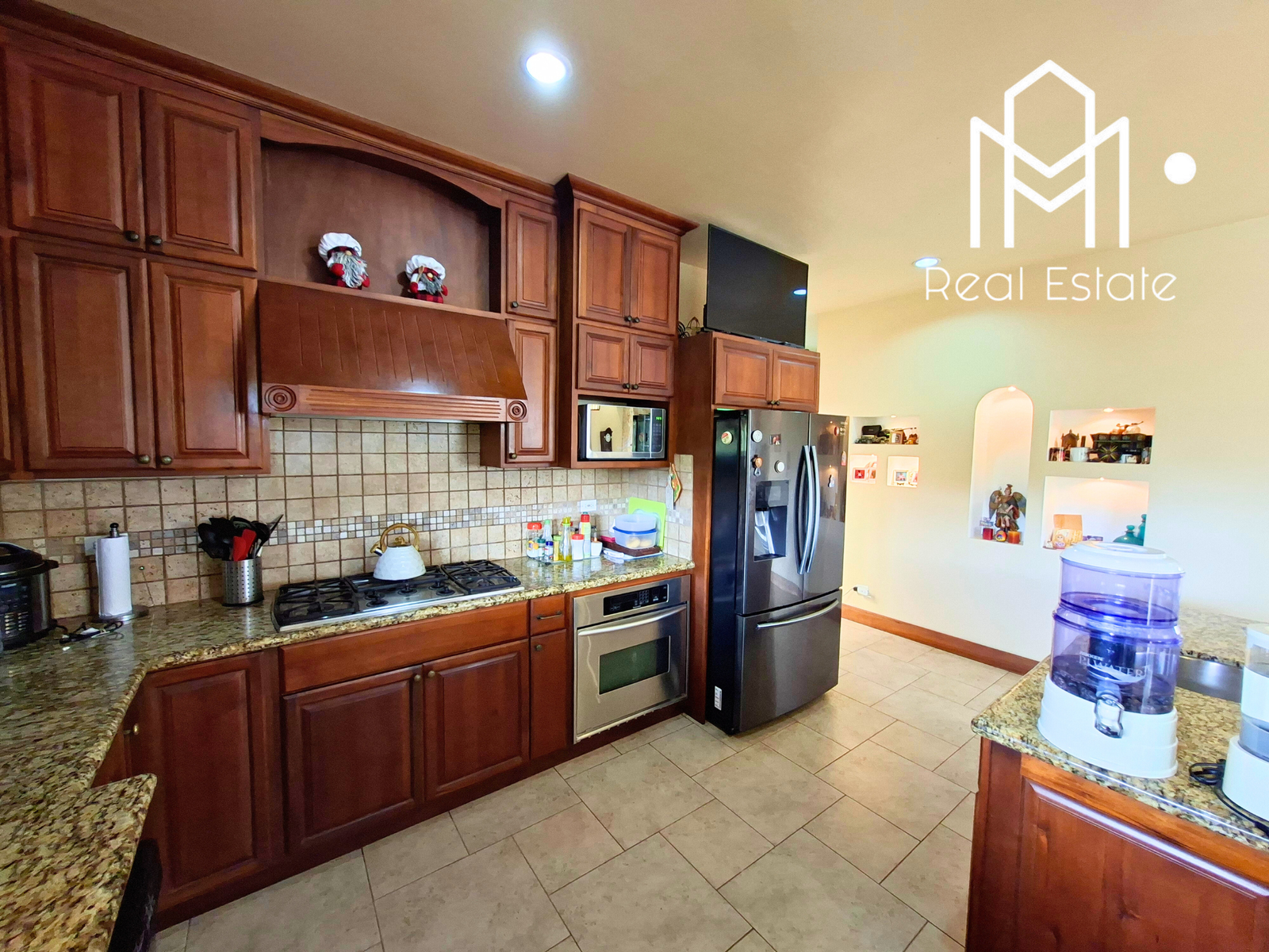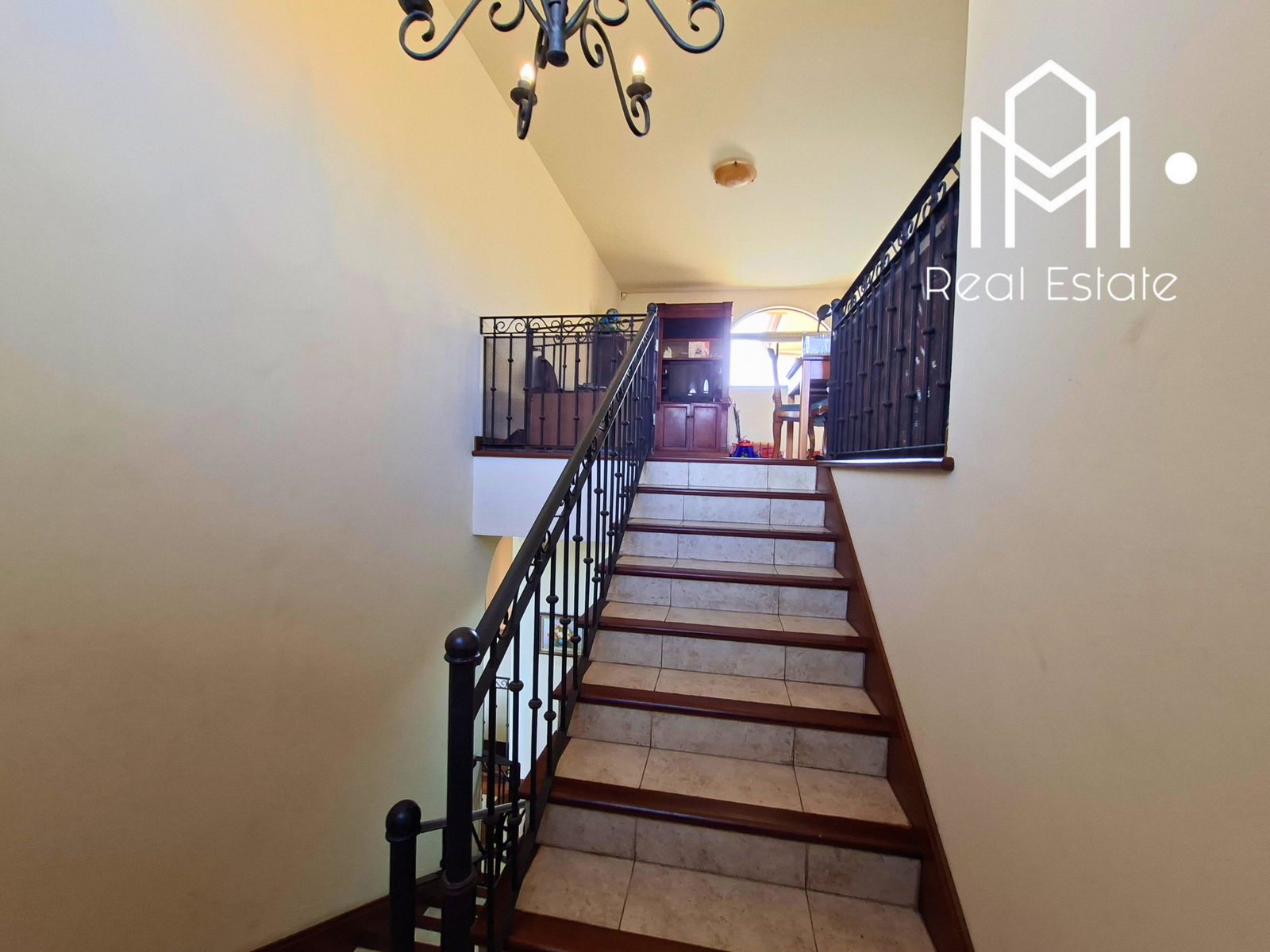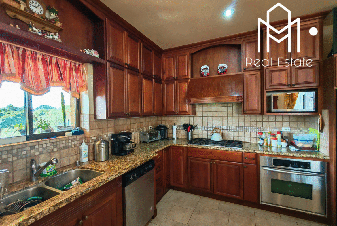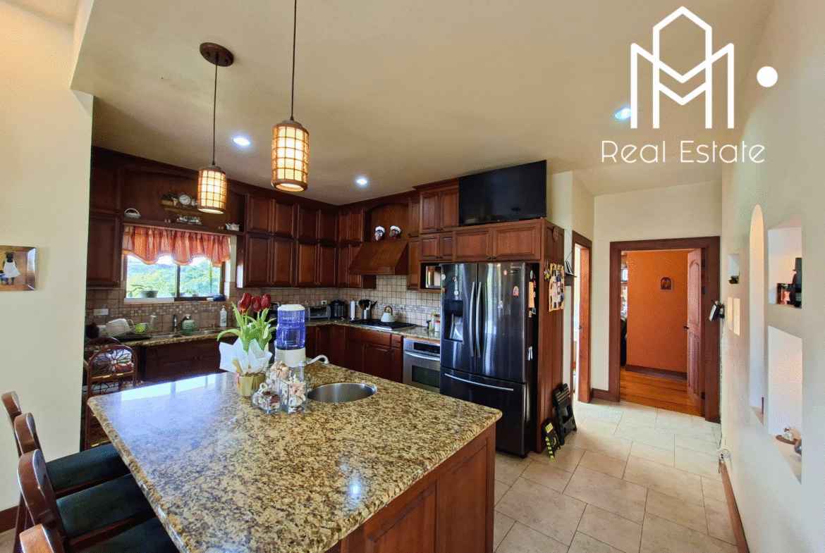 Vestíbulo, sala con chimenea, comedor, medio baño de visitas, cocina grande con isla y sobres de granito, cuarto de pilas, amplia terraza y dormitorio principal con balcón, walk-in closet y baño privado con jacuzzi.