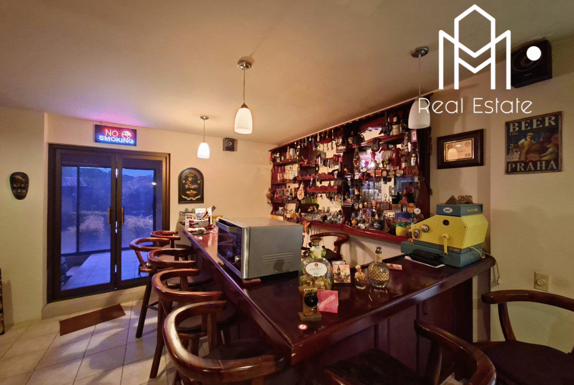 Bar, dormitorios adicionales, baño completo, área recreativa y taller con salida directa al patio.